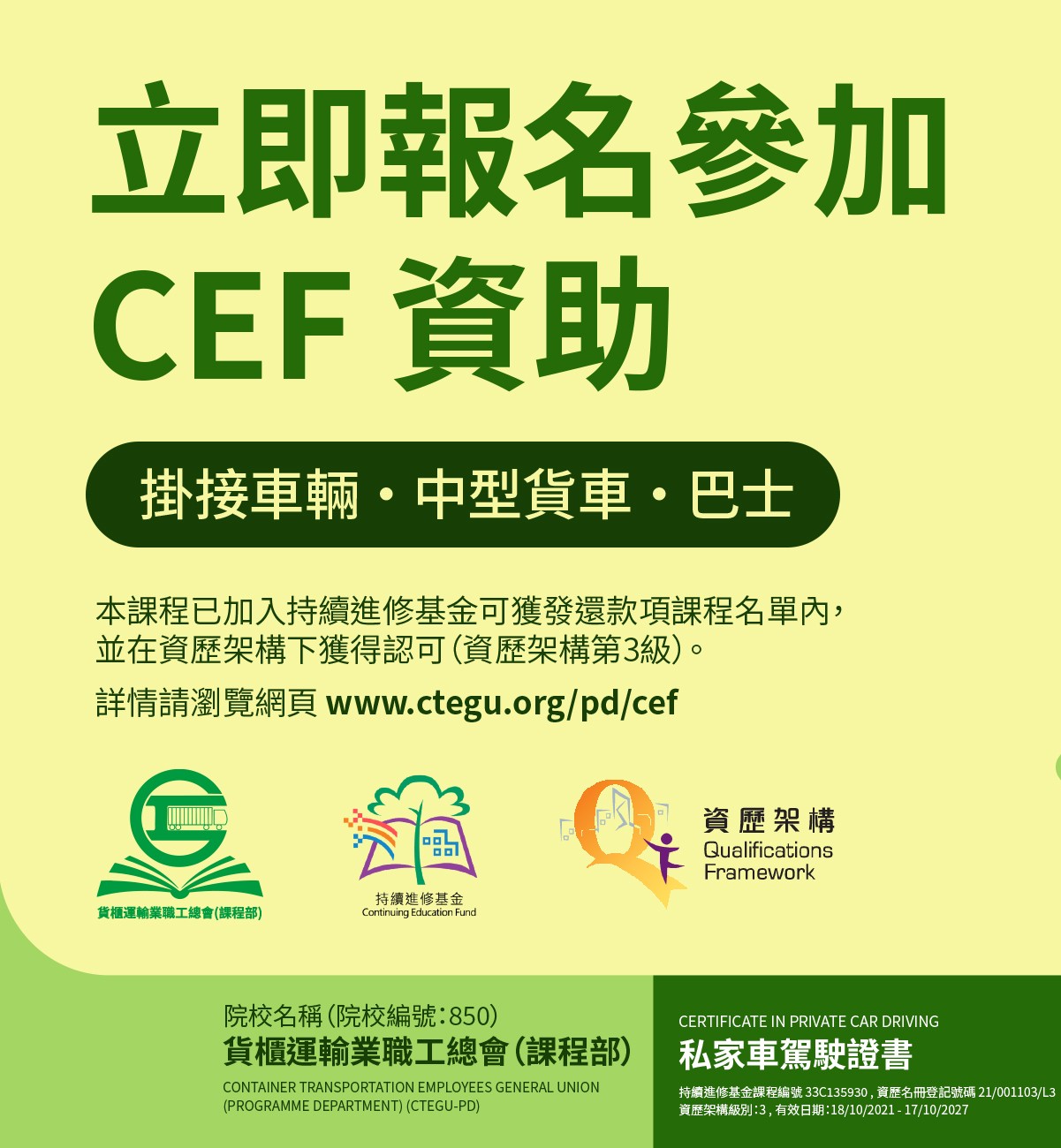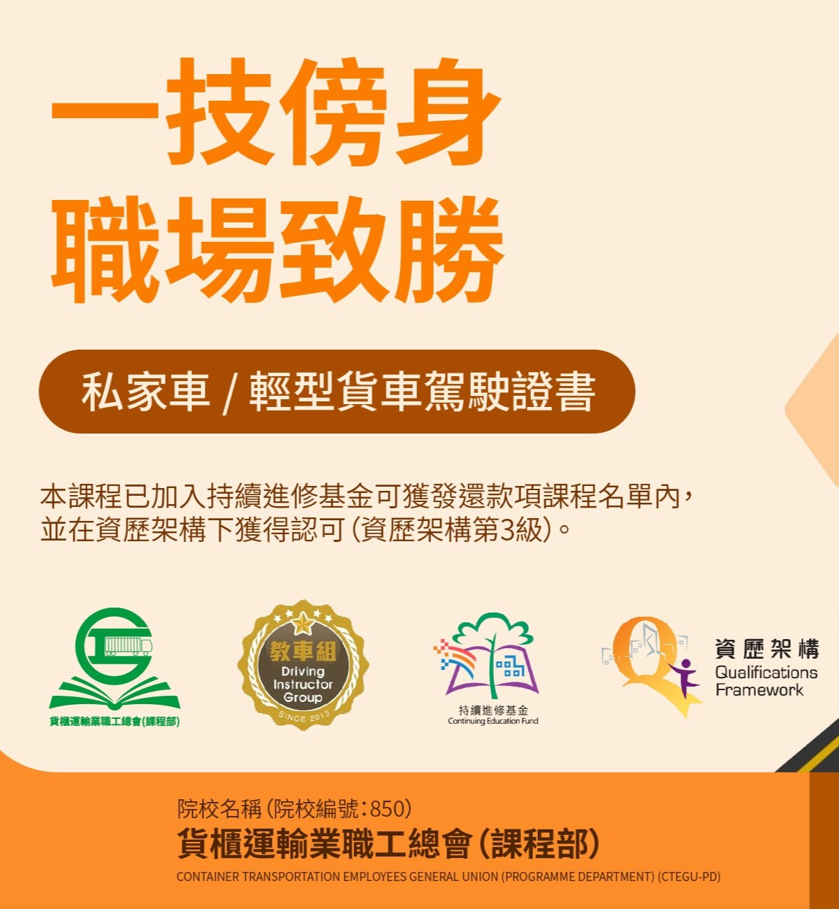 貨櫃運輸業職工總會(課程部)的駕駛證書課程均獲持續進修基金認可。
