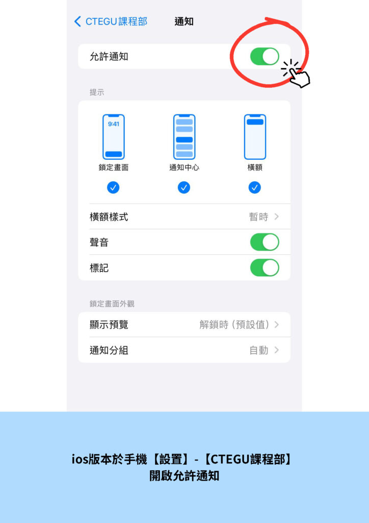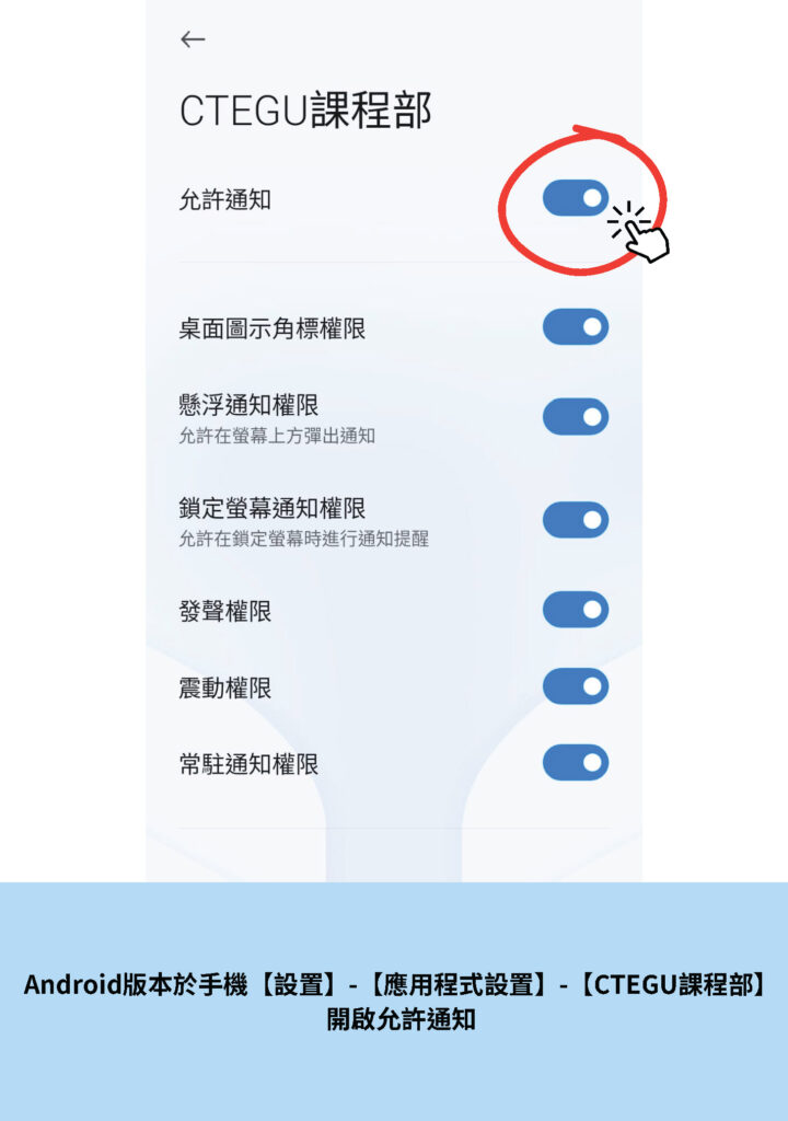 一般電話系統,下載程式後,推播預設為開啟,學員可用以下方式檢查設定:
